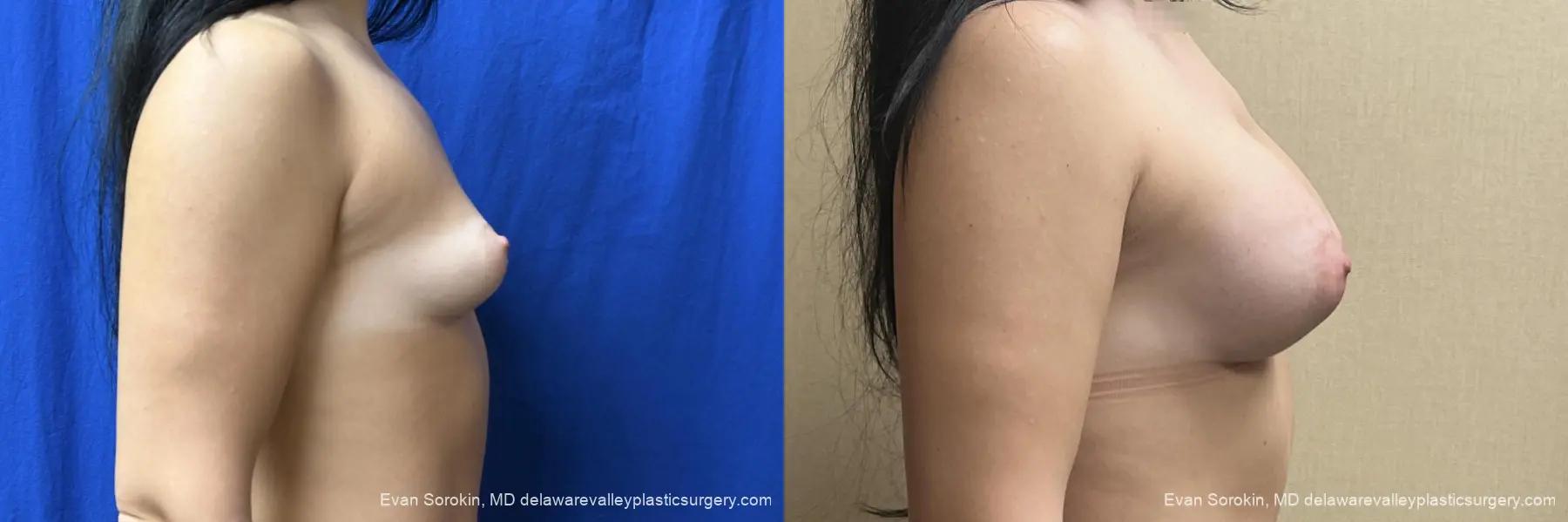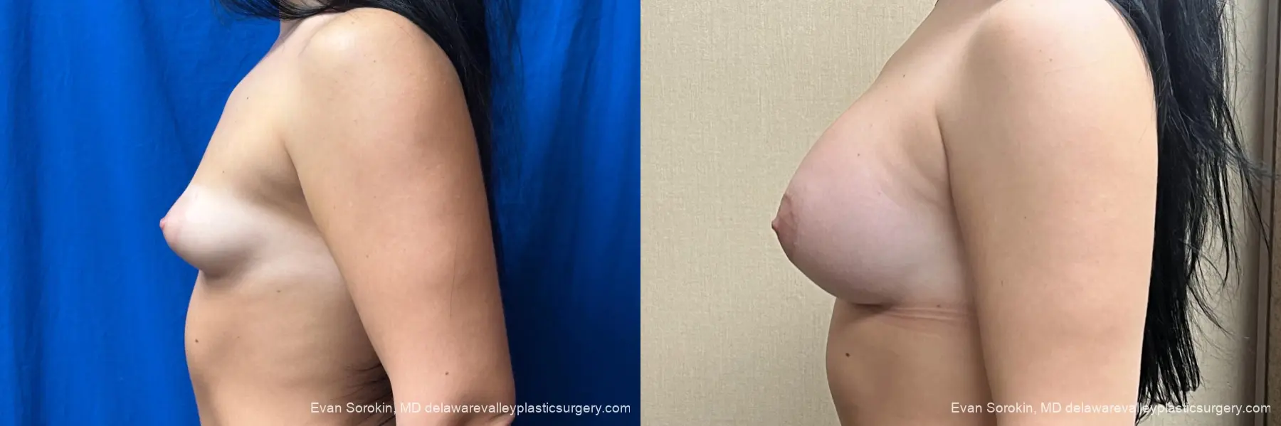 This is a 27 year old lady who came to me desiring fuller, proportional breast augmentation. She wanted to be able to fill out clothes and bathing suits without always having to wear padded bras and also address some asymmetry. She is shown here after rapid recovery subfascial muscle sparing breast augmentation with two different sizes of breast implants. I used a 425cc Demi profile Motiva breast implant on the left and a 380cccc Motiva Demi profile breast implant on the right to achieve better symmetry. I always explain to patients that I can never achieve perfect symmetry. No two breasts are exactly alike and even with two sizes they will not be the same. Regardless they are certainly much closer here and she is delighted with her results.